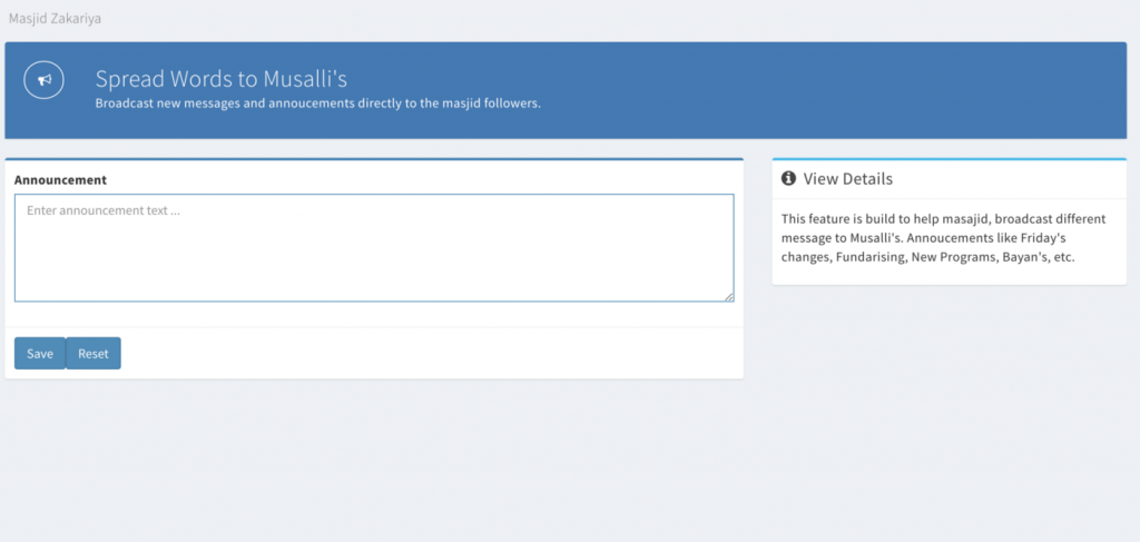 Masjidi Portal is our attempt to provide masjid administrators comprehensive set of tools to manage salah and iqamah time and connect to musalis.